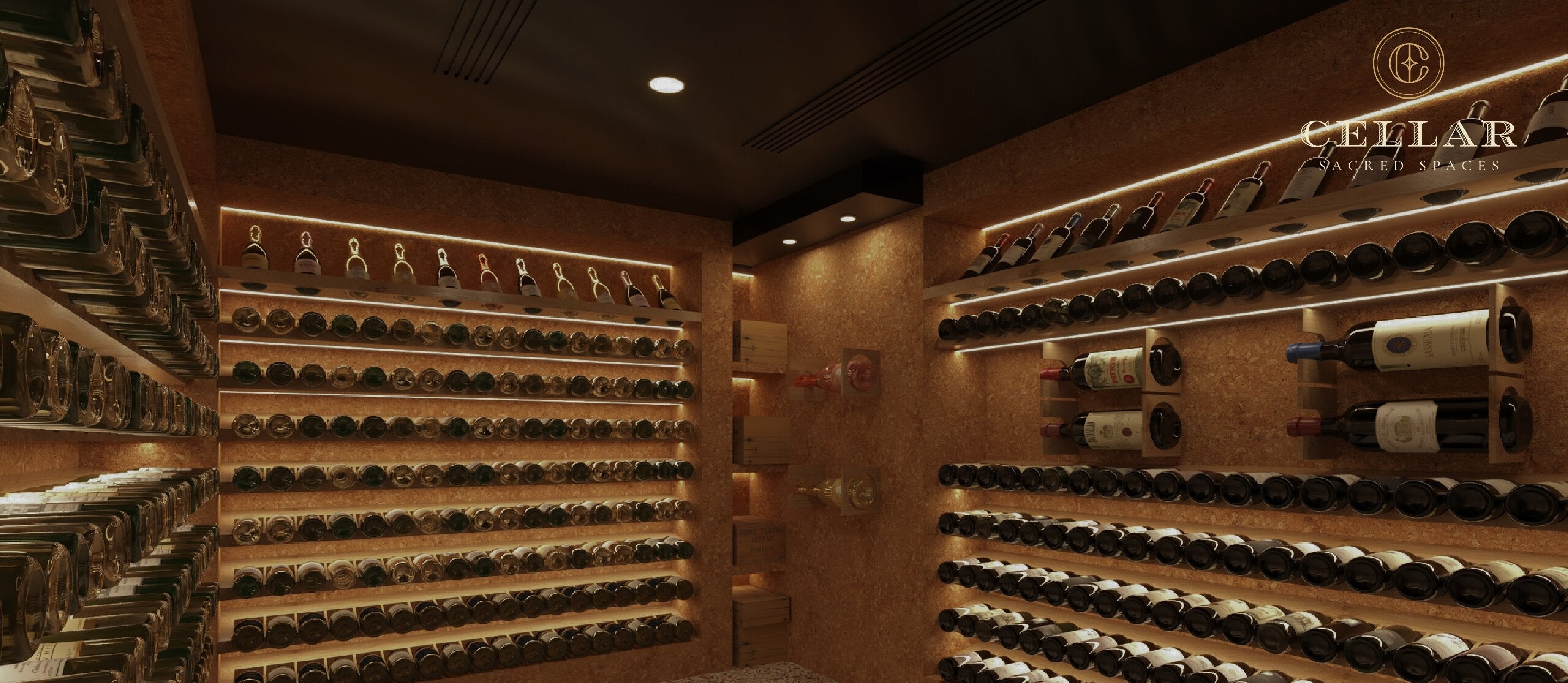 The soft, warm glow of ambient lighting highlights the raw beauty of the materials, creating an experience that is both elevating and humbling—gently reminding you of the precious gift of wine.