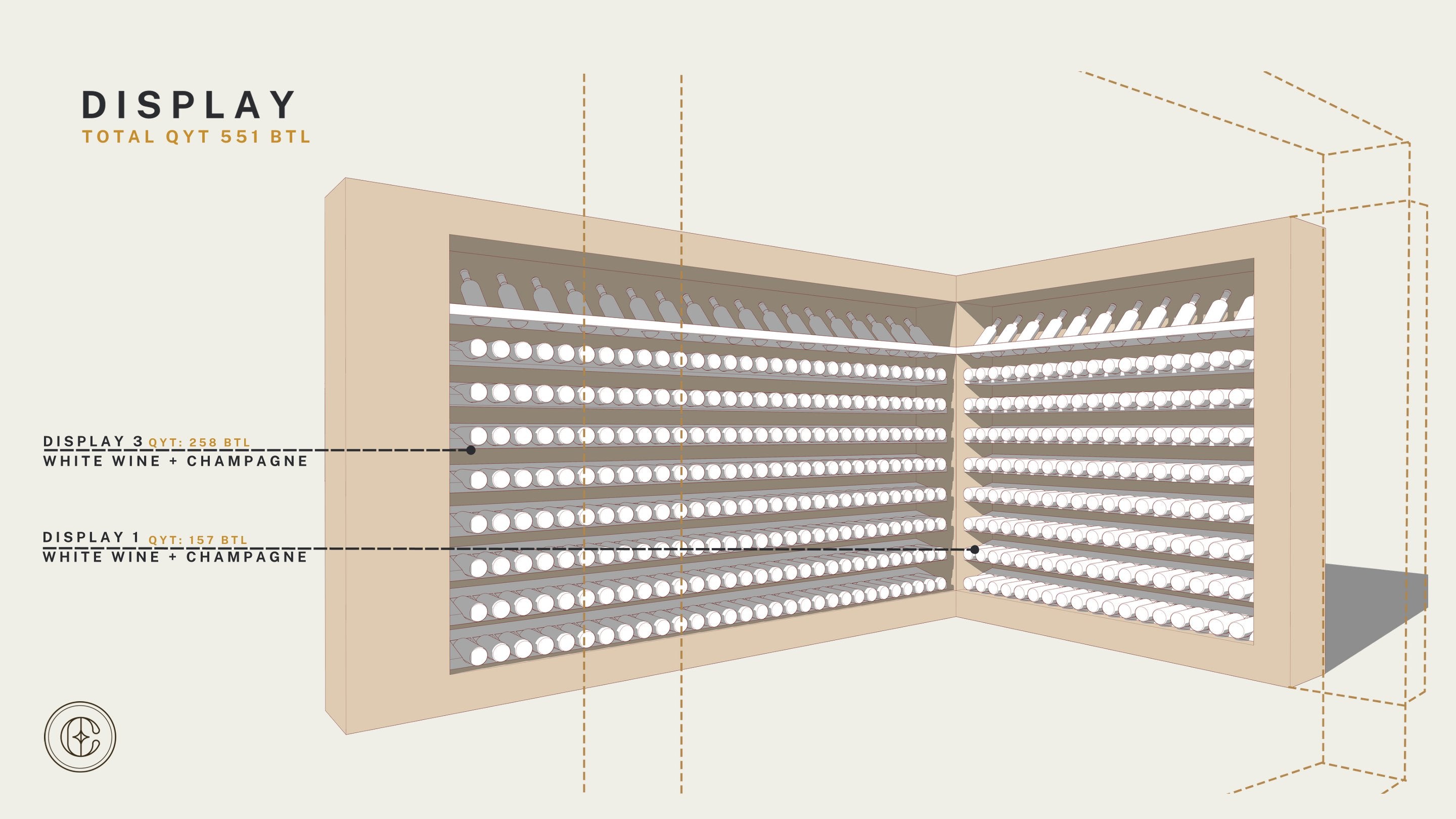 The layout plan is designed to balance functionality with visual storytelling, creating an immersive wine display that is both practical and refined. The space is carefully zoned to distinguish between red wine, white wine, and champagne, while allowing special bottles to be highlighted as focal points.