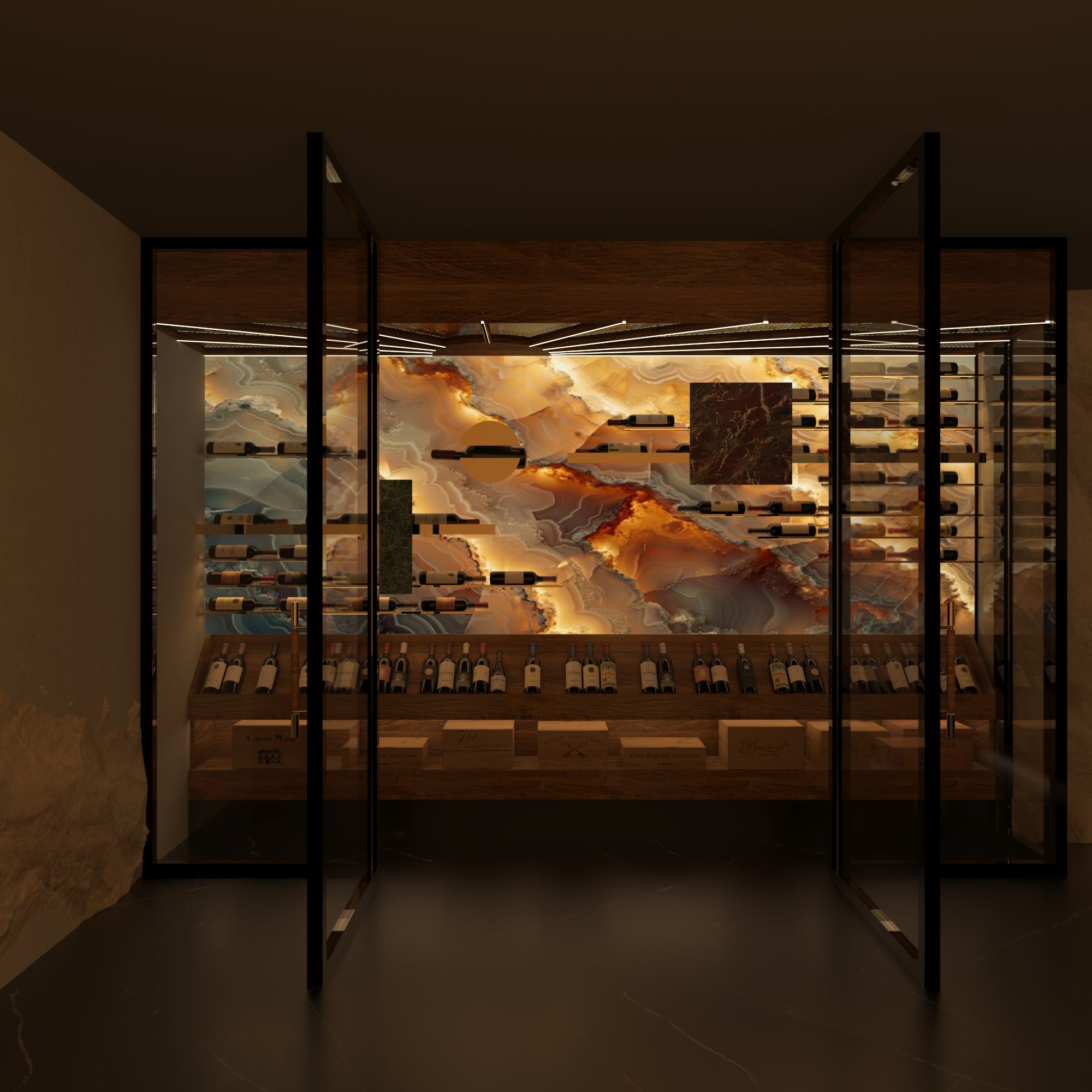 Following the golden ratio, the wine bottles are guided by arcs and contours echoing the curvature of the fresco's figures. This meticulous integration ensures that the shelving evokes the same sense of movement and tension that defines the painting. Furthermore, the backlit onyx, with its intricate veins and ethereal glow, symbolizes the heavens depicted in the fresco. The grain of the stone, illuminated from within, mirrors the swirling clouds and celestial expanses surrounding God's figure